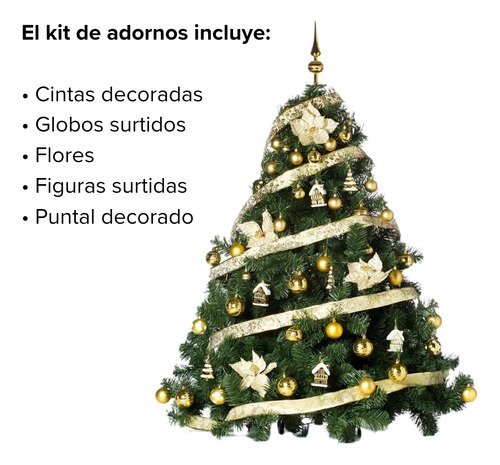 IMPORTANTE - El kit de adornos cubre la cara frontal del árbol, la parte trasera del mismo se encuentra sin adornos (pensado para ubicar el árbol contra una esquina o contra la pared. En caso de querer más adornos, consultar por precio)